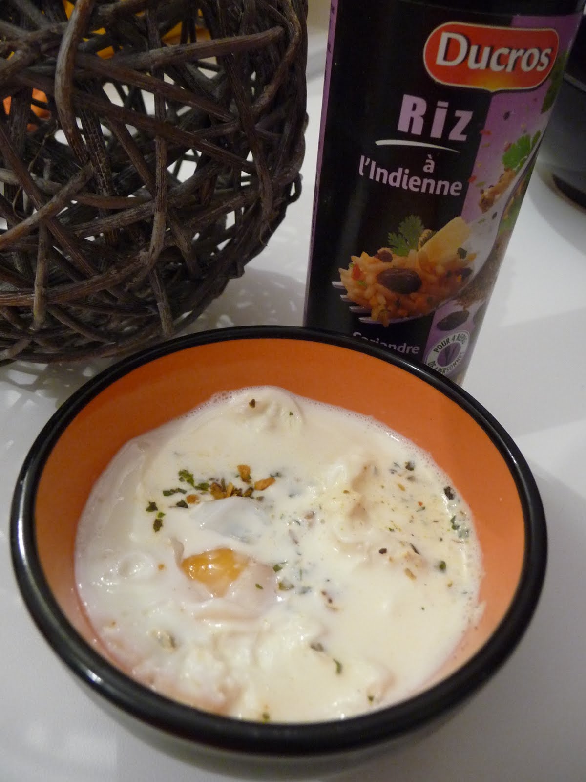 Prendre 4 ramequins. Dans chacun, tapisser de crème mélangée à des épices. Déposer un oeuf par dessus puis terminer par la crème, épicée à nouveau, salée et poivrée. Cuire à 180 pendant cinq bonnes minutes. On accompagne le tout de mouillettes et c’est un régal.