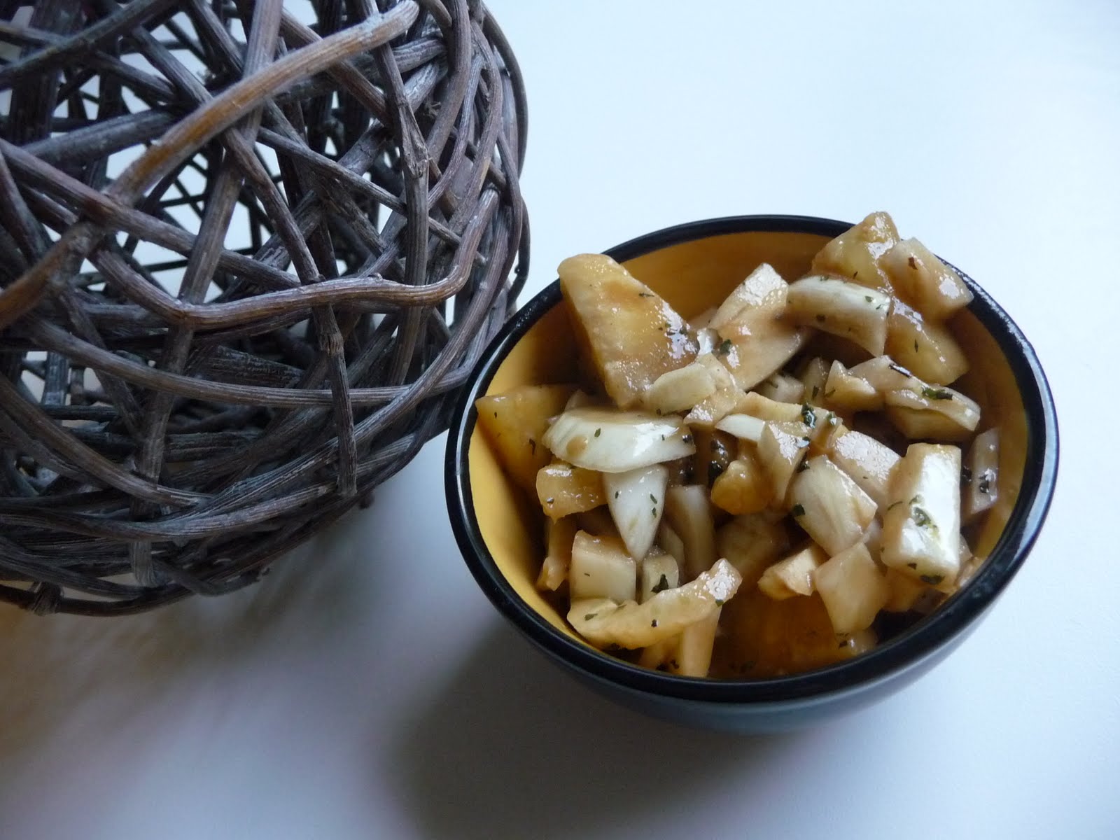 Laver les bulbes de fenouil ; les couper en petits cubes. Couper l’ananas de la même façon. Placer le tout dans un saladier ; parsemer de menthe. Dans un bol, préparer la sauce : mélanger la moutarde, le citron et le vinaigre. Assaisonner. Ajouter ensuite l’huile d’olive petit à petit pour que le tout épaisisse. Mélanger à la salade.