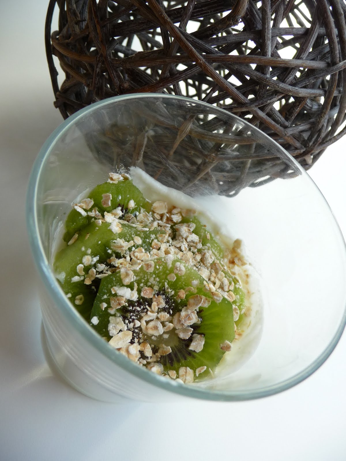 Les matins sont froids et ne donnent pas vraiment envie… Quoi de mieux qu’un bon petit déjeuner pour bien démarrer la journée ! Voici donc la « verrine » fromage blanc, kiwi, miel et flocons d’avoine.