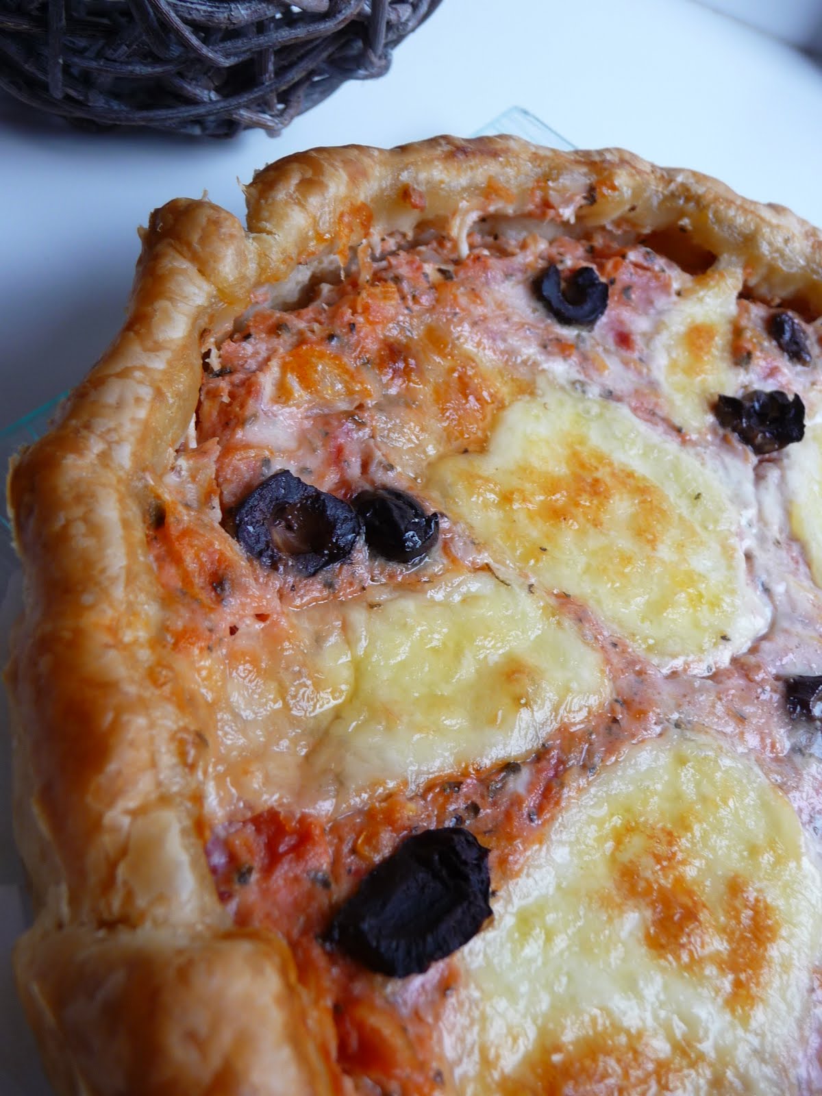 Préchauffer le four à 180. Emincer l’oignon et le faire revenir dans de l’huile d’olives. En parallèle, dérouler la pâte feuilletée et la piquer. Battre les oeufs en omelette puis leur ajouter les tomates, le fromage râpé, le basilic ainsi que le sel et le poivre. Terminer enfin par les oignons. Verser le tout sur la pâte. Couper la mozzarella et les olives en morceaux. Garnir. Enfourner pour 40mn.