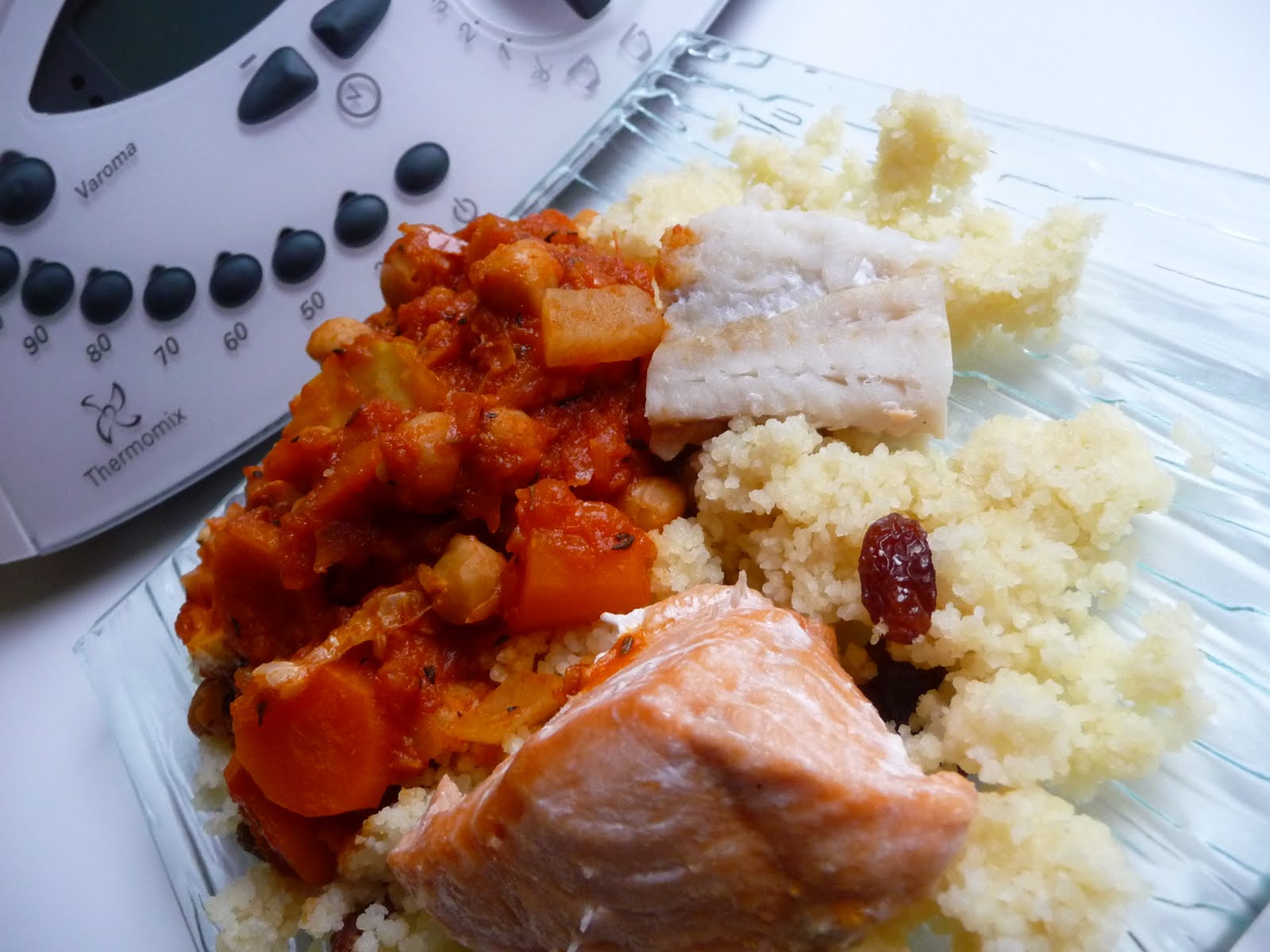 Dans le bol, placer l’oignon coupé en 4, l’ail dégermé, le poireau et mixer 20s à vitesse 4. Ajouter l’huie d’olives, les tomates et leur jus, le sel, le poivre, le ras el hanout et le thym pour 4mn à 100, vitesse 1. Ajouter 50g d’eau et le pimenton pour 5s à vitesse 6. Dans le panier de cuisson, placer : les carottes , le navet, les courgettes (le tout en rondelles), avec les pois chiches. Programmer 10mn, varoma, vitesse 1. En parallèle, préparer la semoule comme indiqué sur le paquet. Laisser reposer et ajouter les raisins secs. A la sonnerie, placer les poissons dans le varoma et la semoule dans le plateau. Programmer 15mn, varoma, vitesse 1.