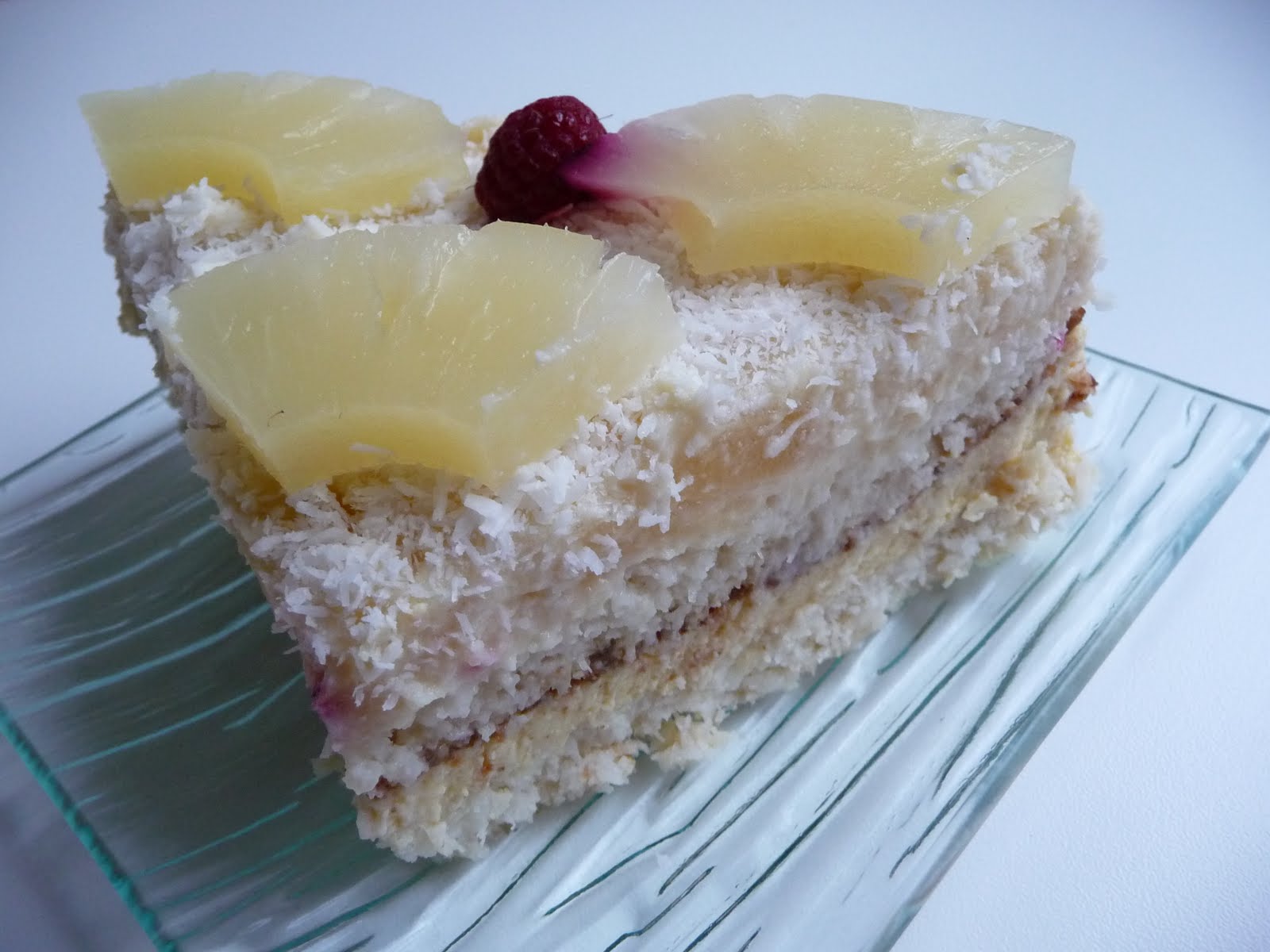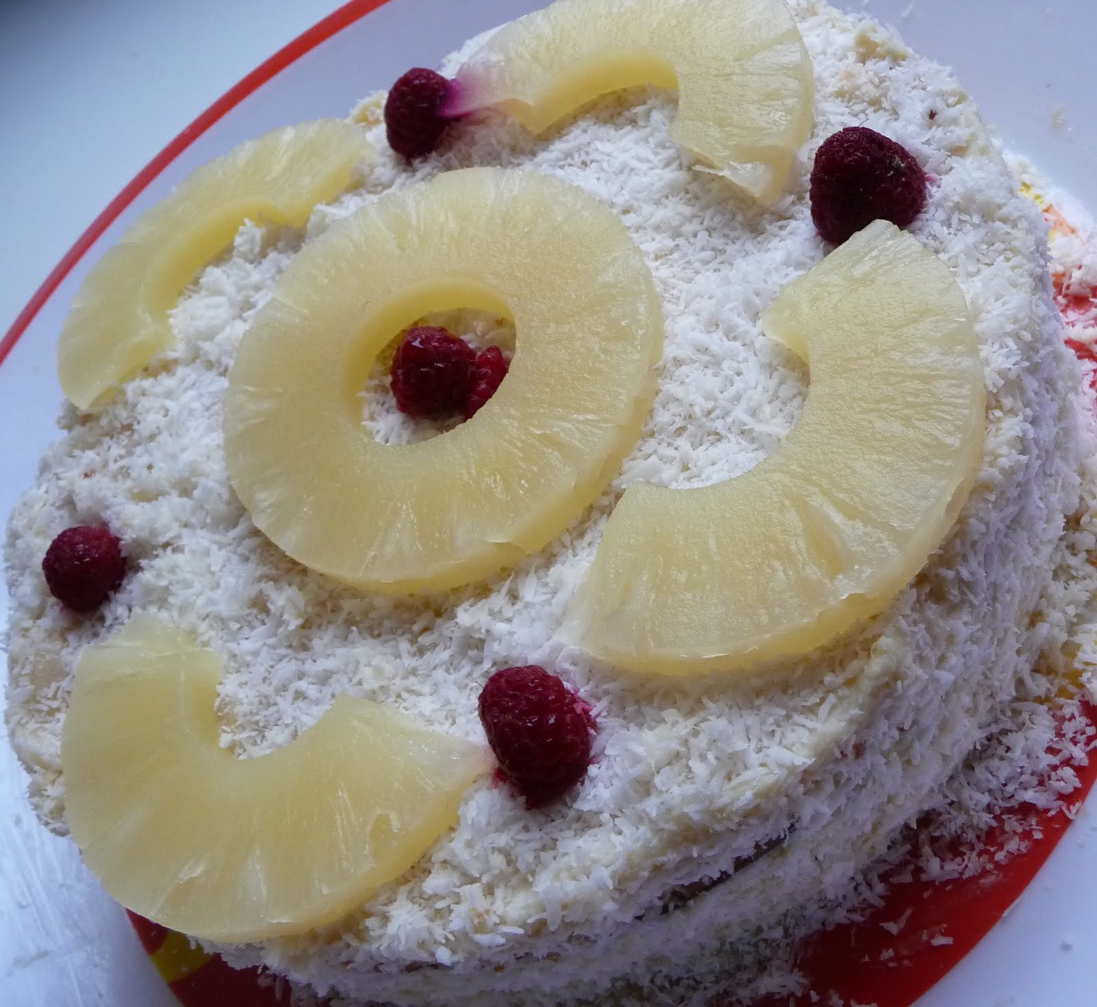 Répartir la noix de coco sur le tour du gâteau, ainsi que sur le dessus. Disposer ananas et framboises pour donner de la couleur.