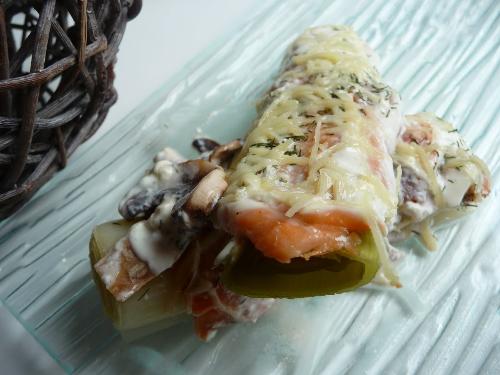Enrouler chaque blanc de poireau dans une tranche de saumon fumé puis les disposer dans le plat, sur les champignons émincés. Mélanger la crème avec les autres ingrédients restant. Verser sur les poireaux. Saupoudrer de râpé et enfourner pour 10mn.