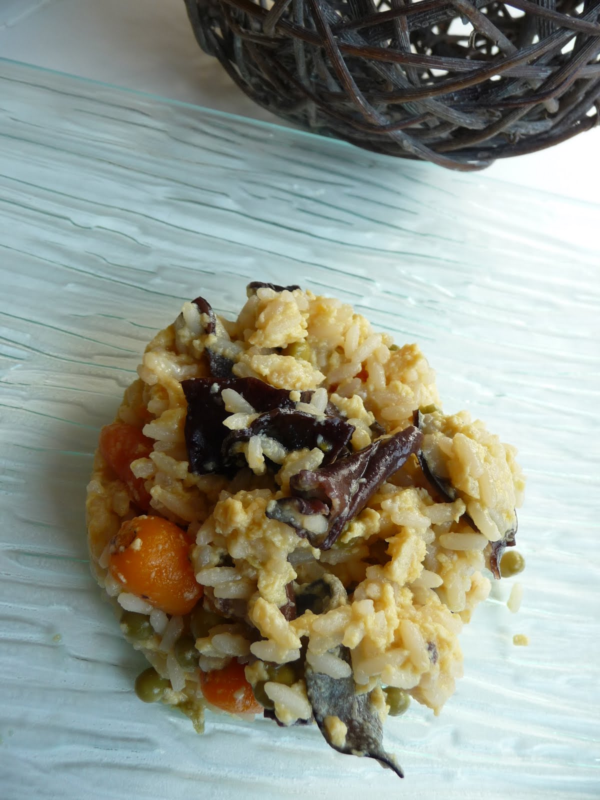 Faire cuire le riz dans une casserole. Couper les champignons noirs et les placer dans de l’eau chaude pendant que le riz cuit. Egoutter les petits pois/carottes. Dans une grande poêle, faire chauffer l’huile d’olive. Y ajouter le riz, les petits pois/carottes, les champignons et le soja. Laisser cuire 5 minutes. Battre les œufs en omelette puis les ajouter au riz agrémenté. Remuer sans cesse avec une cuillère pour faire des œufs brouillés. Le tout est cuit lorsqu’il ne reste plus de « jus » d’œuf. Servir bien chaud !