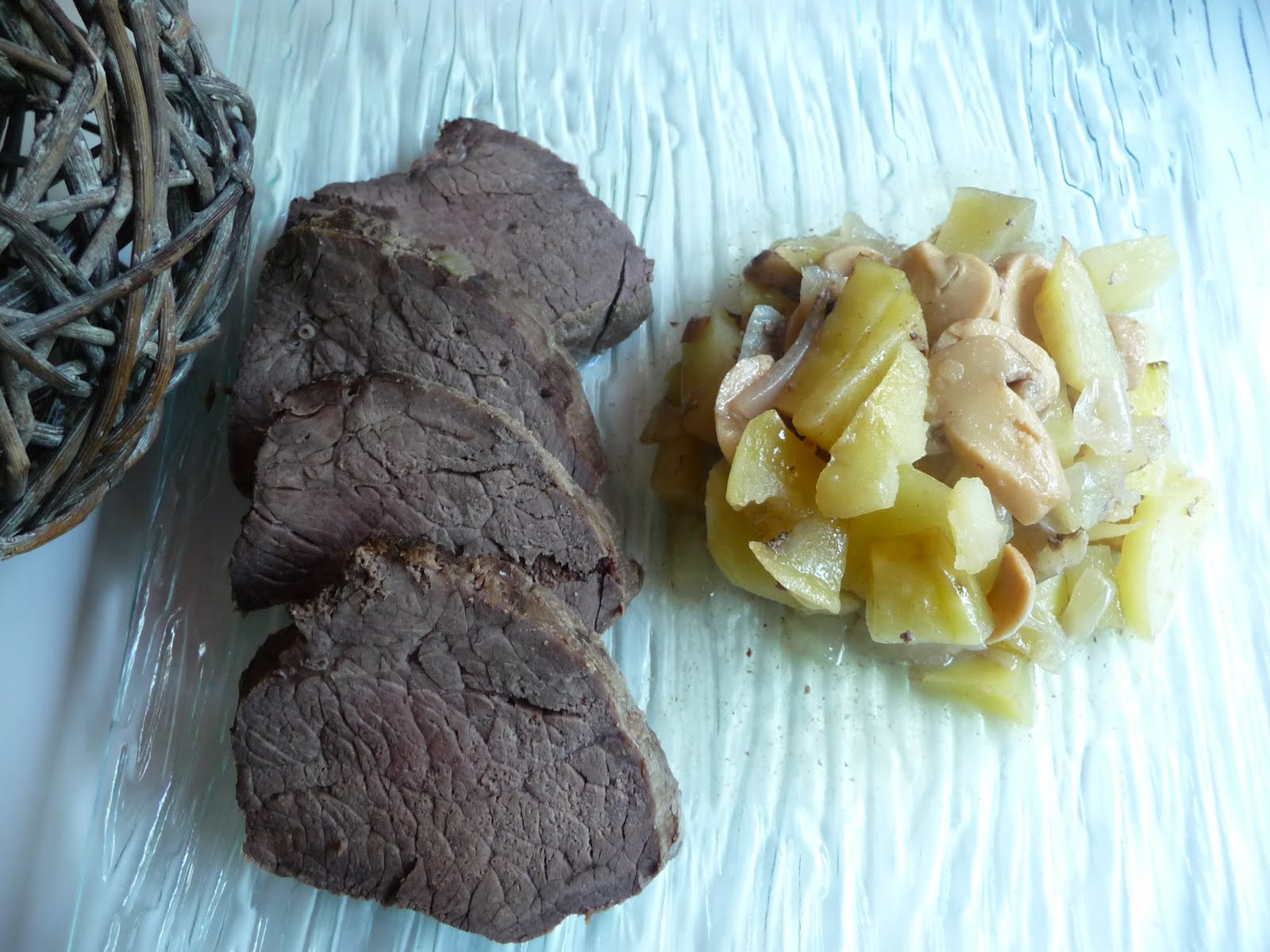 Une tranche de rôti de boeuf et sa garniture pommes de terre/champignons (au four) ?