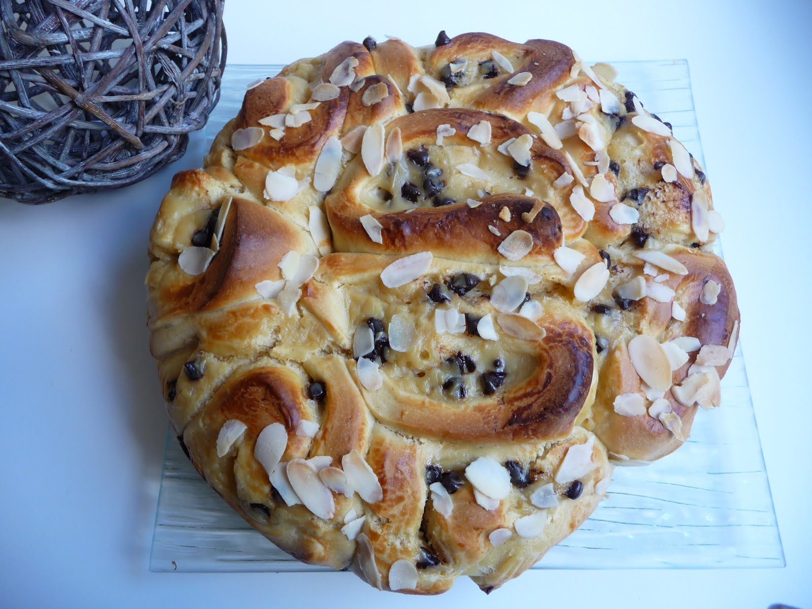 Ensuite, sortir le pâton et l’étaler en rectangle. Déposer la crème et parsemer de pépites de chocolat. Rouler la pâte en boudin serré. La découper en 8 à 10 beaux morceaux. Les disposer dans un moule à manqué, côte à côte. Laisser gonfler à l’abri des courants d’air jusqu’à ce que la pâte atteigne le bord du moule ( 3 heures pour moi). Saupoudrer d’amandes effilées. Cuire 30mn à 180, dans un four préchauffé.