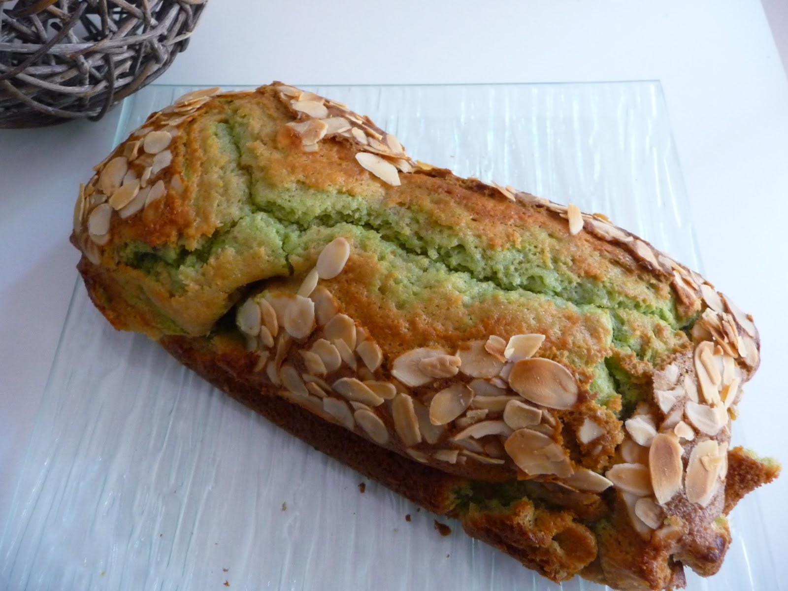 Mélanger ensemble : farine, sucres, levure, huile, oeufs, lait, huile et oeufs . Diviser la pâte en 2. Dans un bol, rajouter la vanille à la moitié de pâte. Dans un autre, la pâte de pistaches et le colorant : bien mixer.Verser dans un moule à cake en faisant des marbrures. Saupoudrer d’amandes effilées. Enfourner 45mn à 180.