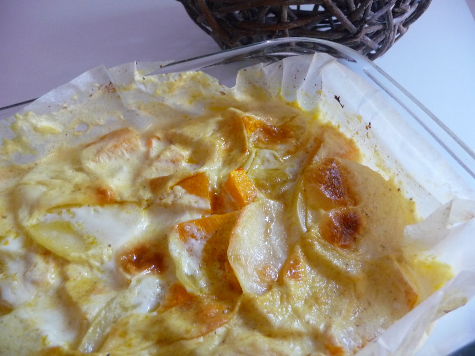 J’avais une courge à finir… Des carottes aussi… Et toujours des kilos de grossesse à perdre (oui, je sais, ça ne fait qu’un mois mais bon…) ! J’avais repéré (il y a un an déjà) ce gratin de pommes de terre, potiron, carottes et raisins secs. C’était l’occasion rêvée pour me lancer !