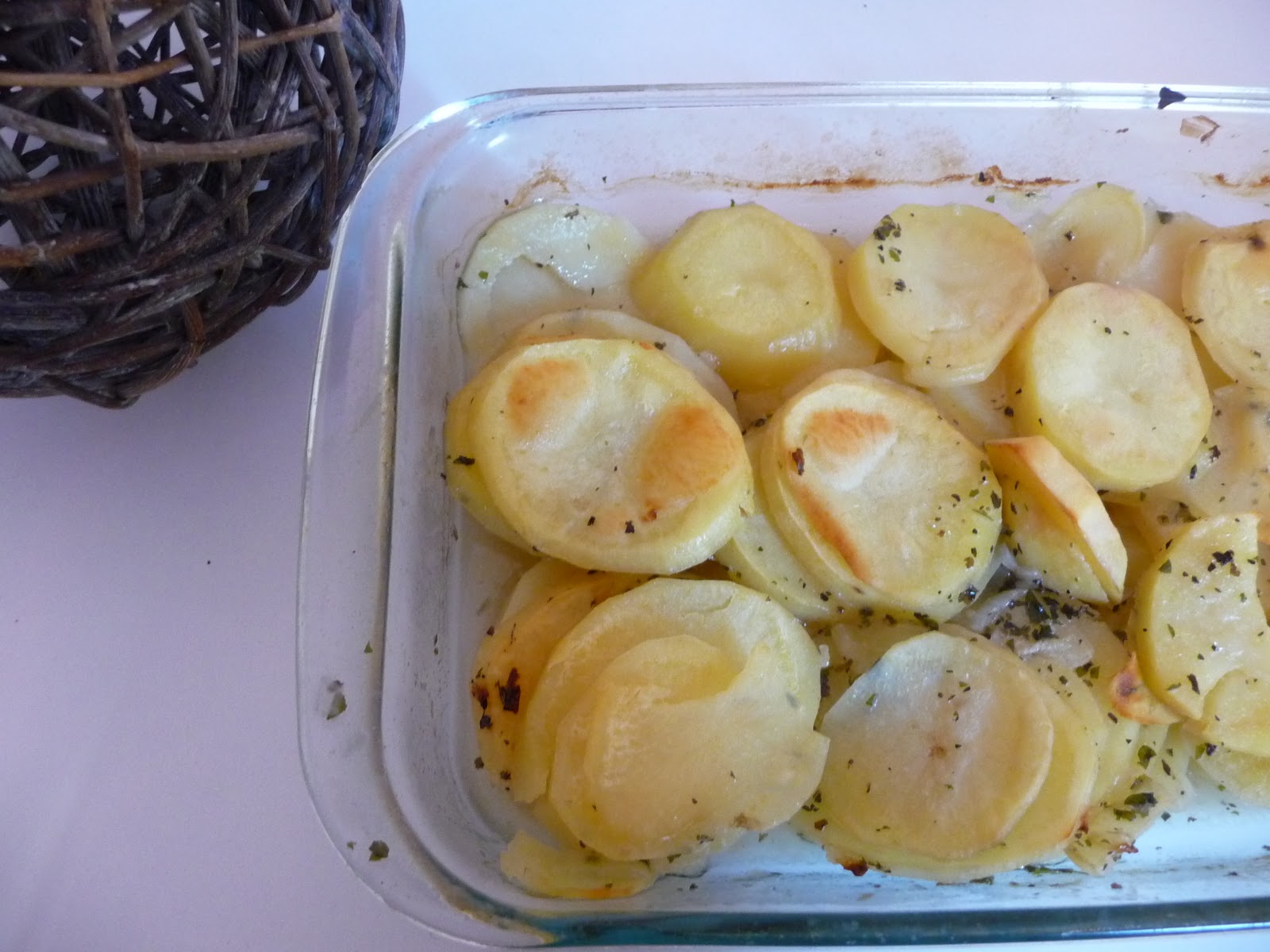 J’ai toujours eu du mal à accommoder les pommes de terre et j’ai fouiné sur le net jusqu’à tomber sur des recettes de pommes de terre façon boulangère, c’est-à-dire cuites au four dans un bouillon. Même si ce n’est pas très présentable, c’était très bon car fondant…