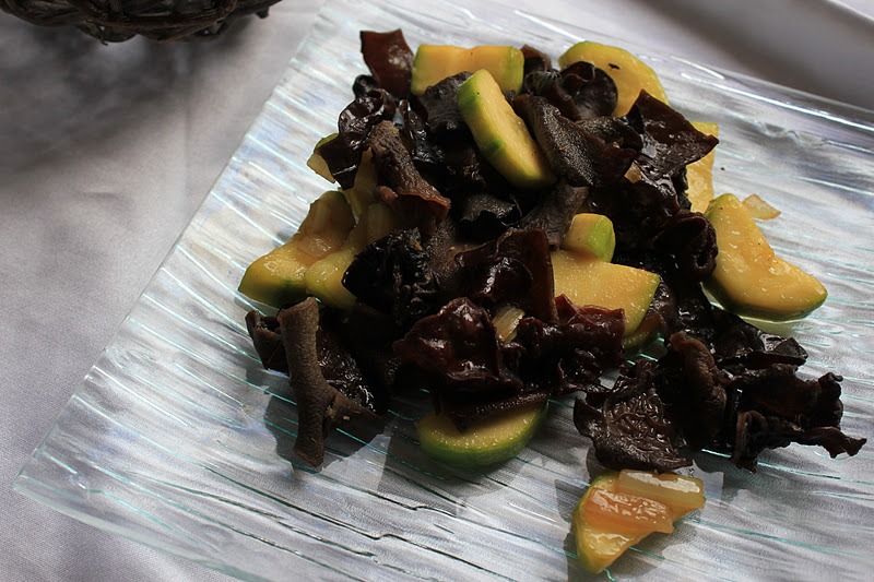Dans un bol, placer les champignons avec l’eau. Les laisser gonfler. Pendant ce temps, dans un wok, mettre à chauffer l’huile. Lui ajouter l’oignon émincé et le gingembre. Lorsque l’oignon est coloré, ajouter les champignons égouttés pour 4/5 minutes. C’est maintenant au tour des courgettes coupées en quartiers de lune. Cuire 2/3 mn puis terminer par le soja et le poivre.