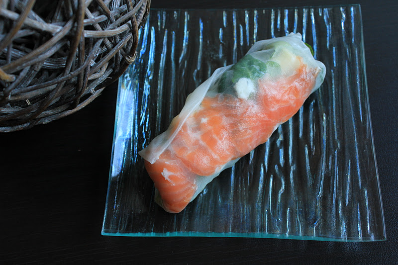 Préparer tous les ingrédients : couper la pomme et le saumon en morceaux. Faire tremper les feuilles de riz dans de l’eau chaude jusqu’à ce qu’elles soient molles. Les poser sur un torchon. Déposer au centre un peu de farce. Replier les 2 côtés puis rouler les rouleaux de printemps. Placer au frais.