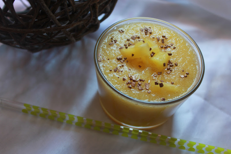 l’ananas. En prélever 1/4 pour la déco. MIxer l’ananas et le sirop de sucre. Mettre au frais et décorer avec l’ananas restant.
