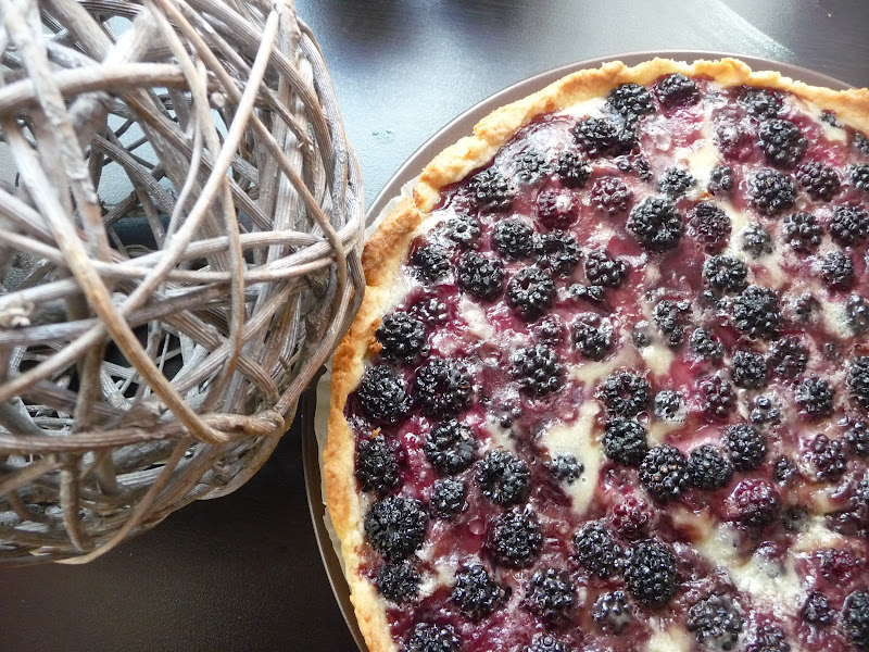 Préparer la pâte en mélangeant tous les ingrédients. Former une boule, la mettre au frais pour 30mn. Etaler la pâte et la placer dans un moule. La piquer et la réserver. Dispoer les mûres par-dessus. Préparer la crème en mélangeant les ingrédients pour. Bien battre. Napper les mûres de la crème. Enfourner pour 30mn à 180.