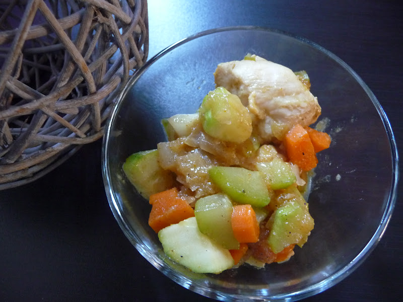 J’ai repéré dans le magazine « croquons la vie » cette recette d’émincé de poulet aux pommes et aux légumes. Plutôt simple et agréable.