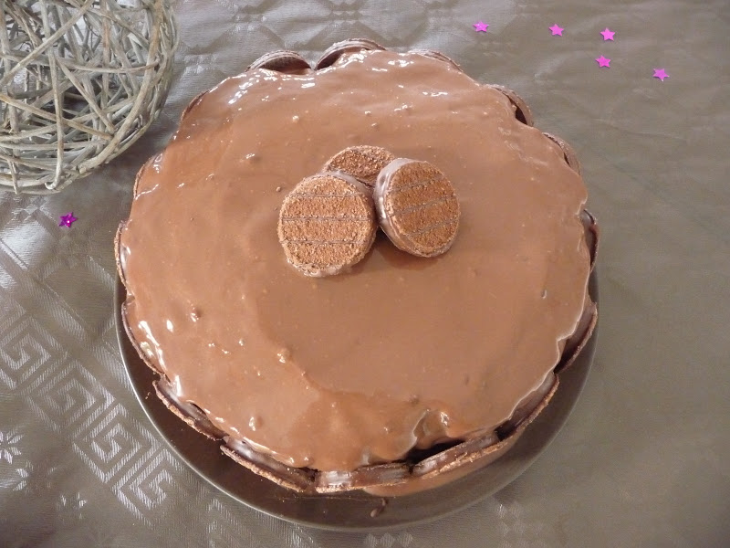 Coller les parties échangées entres elles avec du nutella (sans oublier de coller les deux étages !) Préparer le glaçage. Faire chauffer 3 càs avec le chocolat. Lorsque la ganache est brillante, ajouter le reste de la crème et le miel. Napper le gâteau avec le reste. Laisser prendre au frais. Décorer avec des gâteaux meringués au chocolat.
