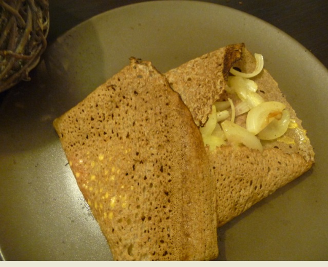 En passant devant Flunch, j’ai repéré leur « galette américaine ». Une galette de sarrazin garnie de viande hachée, d’oignons revenus et de sauce burger. Aussitôt vue, aussitôt réalisée pour petit chéri d’amour qui a apprécié. Ce n’est certes pas de la grande cuisine, mais c’est celle des soirs où l’on n’a pas envie de trop se fouler… ;p