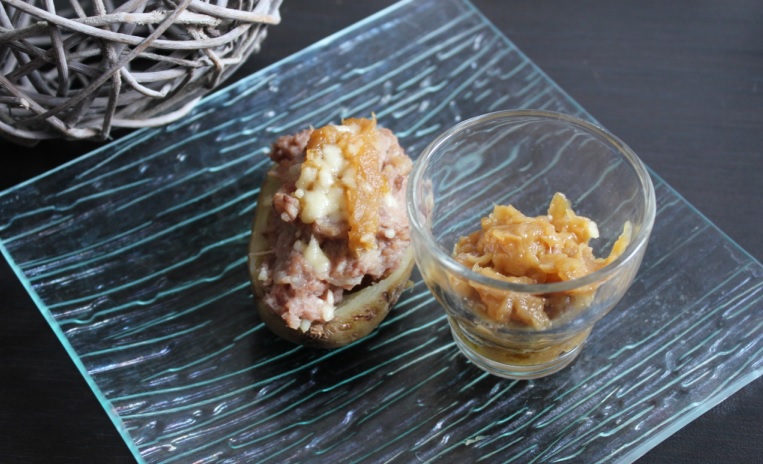 En bouquinant l’un de mes livres thermomix, mon regard s’est porté sur ces pommes de terre farcies sur leur lit d’oignons caramélisés (au thermomix). Un repas complet, qui peut se préparer à l’avance et se cuire au dernier moment et surtout, un plat qui s’annonçait gourmand. Ce fut le cas. La confiture d’oignons était un chouya trop sucrée pour nous mais ce n’est qu’un détail.