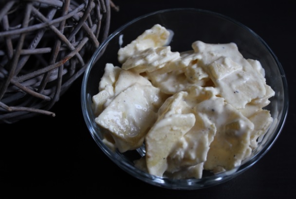 Eplucher la pomme et la trancher finement à l’aide d’une mandoline. Recouvrir les tranches de citron pour qu’elles évitent de noircir. Leur ajouter la mayonnaise, le yaourt, le sel, le poivre et le curry. Mélanger le tout.