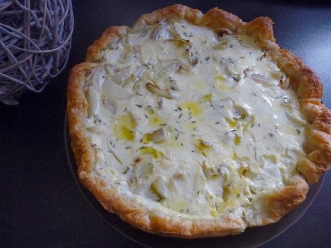 Démouler la pâte feuilletée. La cuire à blanc 20mn à 180. En parallèle, éplucher et couper les oignons en 6. Les placer dans un plat à gratin, les arroser du mélange huile d’olive, sucre et vinaigre balsamique. Les enfourner pour une trentaine de minutes à 200. Les égoutter. Battre les oeufs avec la crème, le lait, le fromage, le sel, le poivre et le thym. Sur la pâte, disposer les oignons et recouvrir de la crème. Cuire 35mn à 180.
