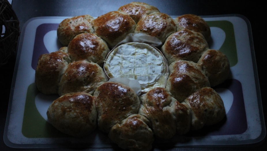 Dans la cuve, placer tous les ingrédients (sauf le jaune d’oeuf) en commençant par les liquides. Programmer « Pâte à pâtes » (15mn pour moi). Sortir le pâton, former une boule et la mettre à reposer minimum 1h pour qu’elle double de volume. Au terme de ce temps, former une vingtaine de boules. Les disposer autour du camembert sorti de son papier mais maintenu dans sa boîte. L’entourer d’un peu de papier sulfurisé avant d’y placer les boules de façon harmonieuse. Laisser reposer au minimum 30mn. Dorer le pain. Enfourner le tout 15mn à 180.