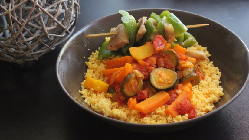 Un de ces midis, ma maman est venue manger avec moi ; j’avais envie de lui préparer un bon plat, bien goûteux. J’avais opté pour un couscous aux légumes et brochettes de cabillaud et ça lui a beaucoup plu. Je partage !