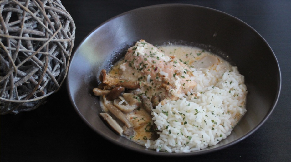 La matin, préparer la marinade et y laisser « baigner » les filets de poisson. Au moment M, faire chauffer un peu d’huile dans une casserole et y mettre 2 échalotes émincées à revenir. Ajouter les champignons pour 10mn. Terminer par le poisson et sa marinade ainsi que la crème de coco. Cuire 10mn à couvert et servir avec du riz.