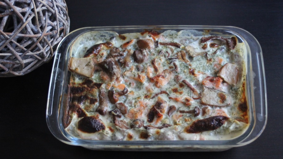 Préchauffer le four à 180. Dans une casserole, mettre à revenir l’oignon émincé dans l’huile d’olive. Ajouter ensuite les champignons et l’ail déshydraté. Verser dans un saladier et leur ajouter du poivre, de l’aneth, la crème ainsi que le saumon en cubes. Dans le fond d’un plat à gratin, disposer une plaque de ravioles. Répartir la garniture en alternant champignons et ravioles. Enfourner pour 20mn.