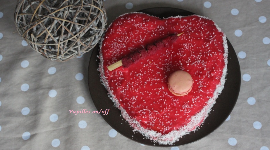 Tous les ans je vous le répète : la Saint-Valentin rime avec l’anniversaire de ma maman. Alors, cette année, j’ai tenté de faire coïncider les deux évènements en lui préparant ce gâteau coeur de la Saint Valentin au chocolat et aux framboises, glaçage rouge à l’agar agar (au thermomix ou sans). Pour la petit histoire, je rêve de réaliser le fameux glaçage rouge qu’Imane, du Meilleur Pâtissier, a proposé il y a quelques années. Petit problème, elle utilise de la gélatine animale et je n’en consomme pas. J’ai donc tenté ce glaçage à l’agar agar qui me semblait ressemblant mais qui, au final, ne l’était pas tant que ça. Il a tout de même joliment recouvert mon gâteau ; j’en cherche donc toujours un autre … Si vous avez une recette, je prends !