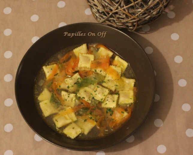 Même si le printemps commence à s’installer, les soirées restent fraîches. Voici donc un bouillon de légumes aux ravioles complet et bourré de vitamines.