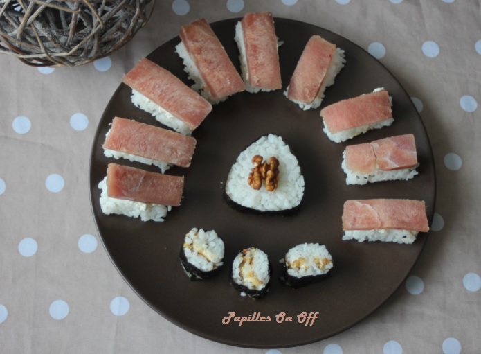 Ces derniers mois, je suis très branchée « soirées culinaires à thème ». Un soir c’est italien, le lendemain mexicain et le soir d’après, japonais. C’est ainsi que ces sushis au thon et ces makis au bleu et aux noix (au thermomix) ont trouvé leur place sur ma table. Des saveurs peu conventionnelles mais c’est l’avantage du fait maison. Et pour une cuisson du riz sans thermomix, c’est par ici 😉