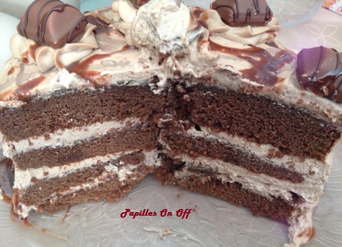 Une nouvelle fois, voici l’oeuvre de ma maman qui a décidé de réaliser ce superbe layer cake nutella et kinder bueno (au thermomix ou sans). Partie de cette recette, elle l’a adaptée en optant pour notre recette de base de gâteau au chocolat fétiche. Dois-je vous préciser qu’il avait un goût de reviens-y ?!