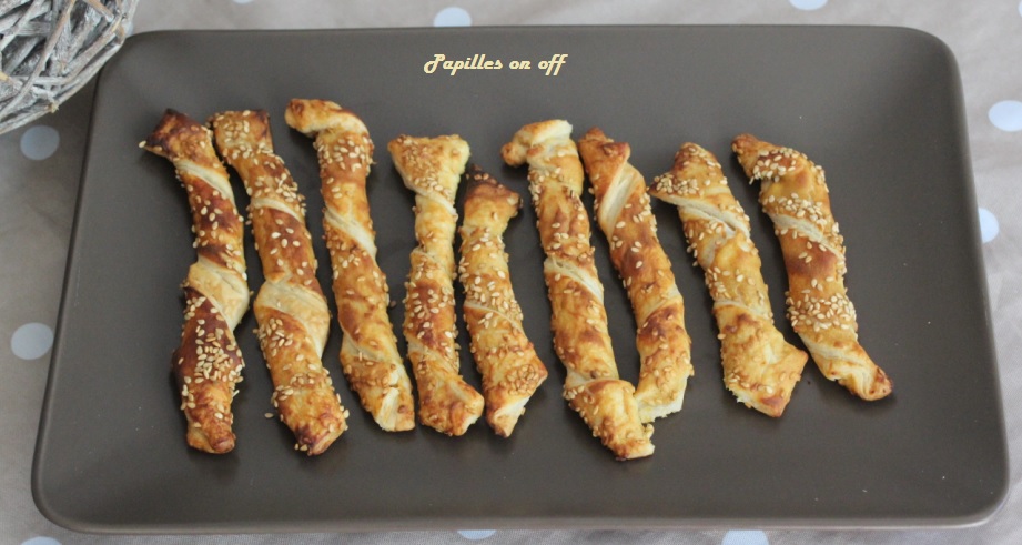 Badigeonner la pâte déroulée de moutarde. Ensuite, découper des petits rectangles et les torsader. Saupoudrer enfin de sésame et placer sur une plaque de four chemisée. Cuire pendant 15mn à 200.