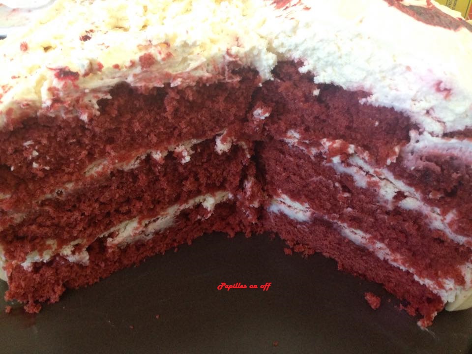 Préchauffer le four à 170. Dans un bol, verser le lait et le vinaigre blanc. Laisser de côté pour que cela fermente un peu. En parallèle, dans un saladier, battre le beurre et le sucre pendant 3mn environ. Leur ajouter les œufs, la vanille, le cacao, le colorant rouge et le lait. Bien battre. Finir par ajouter la farine, le sel, le bicarbonate jusqu’à obtenir une pâte lisse. Diviser votre pâte en trois et la verser dans 3 moules chemisés de 18cm (350g de pâte à chaque fois pour moi !). Cuire 20 à 25mn. Laisser refroidir entièrement. En parallèle, préparer le glaçage. Dans un saladier, détendre le philadelphia, le mascarpone et la vanille pendant quelques secondes. Leur ajouter le sucre glace et continuer de battre. Terminer par la crème. Continuer à monter le tout comme une chantilly (pas de panique, au début c’est liquide mais c’est normal). Stopper une fois la consistance voulue atteinte. Réserver au frais. Procéder au montage en plaçant le premier gâteau sur un plat de service. Le recouvrir de crème puis du second gâteau. Réitérer l’opération avec la crème et le dernier gâteau. Recouvrir entièrement le layer cake d’un très fine couche de glaçage. Mettre au frais 30mn. Ressortir le layer cake et le décorer comme souhaité.