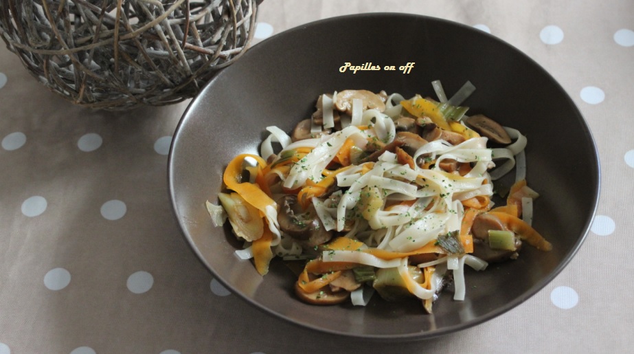 aux légumes. Le soir, nous l’avons mangé comme suit ; le lendemain, j’y avais incorporé des lamelles de poulet cuites par ailleurs pour en faire un plat complet. Nous avons été charmés par les nouilles de riz, que je n’achète d’habitude jamais…