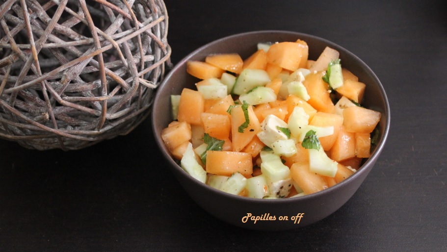 Peler et épépiner le melon et le concombre. Les couper en cubes et les placer dans un saladier. Leur ajouter la feta, un filet d’huile d’olive, du sel, du poivre et de la manthe fraîche ciselée. Servir bien frais.