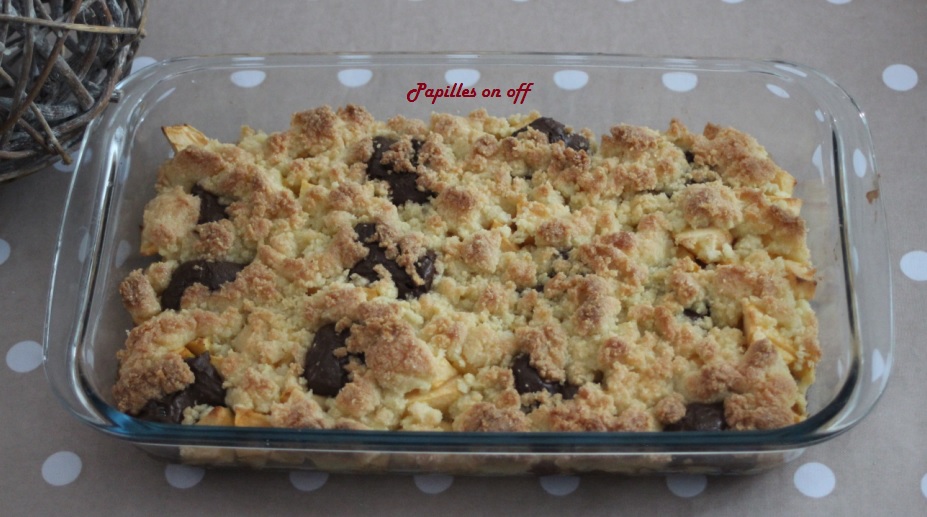 Aujourd’hui, je vous propose un dessert gourmand, à la fois croustillant et fondant ; j’ai nommé le crumble pommes et chocolat (au thermomix ou sans) que j’avais réalisé pour les collègues gourmandes. Une recette qui donne de quoi se régaler avec trois fois rien.
