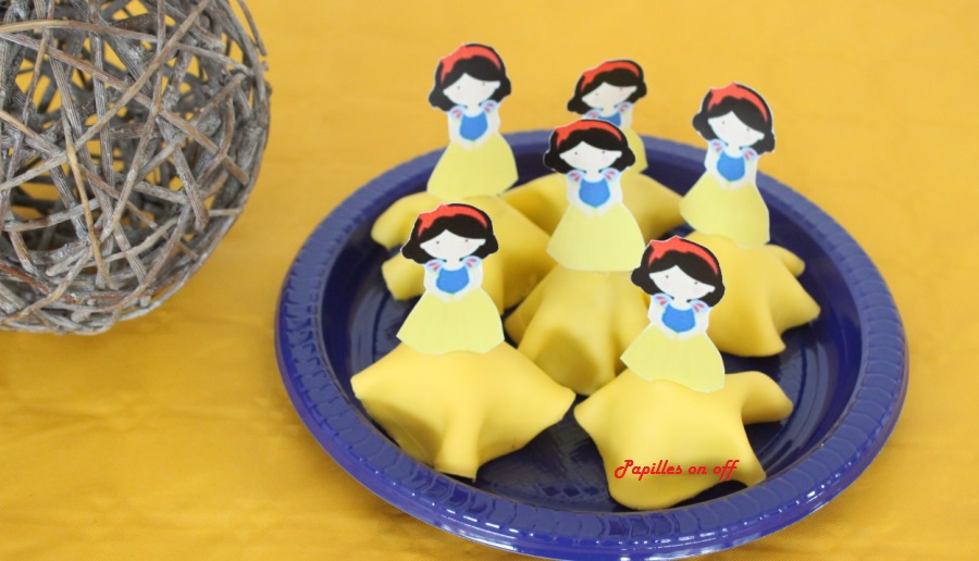Sur ma Sweet table anniversaire Blanche-Neige, étaient également invités de jolis petits cakes pop aux oréos habillés en Blanche-Neige (au thermomix ou sans). Il a suffit de quelques étiquettes, de piques et d’un peu de pâte à sucre pour les transformer.