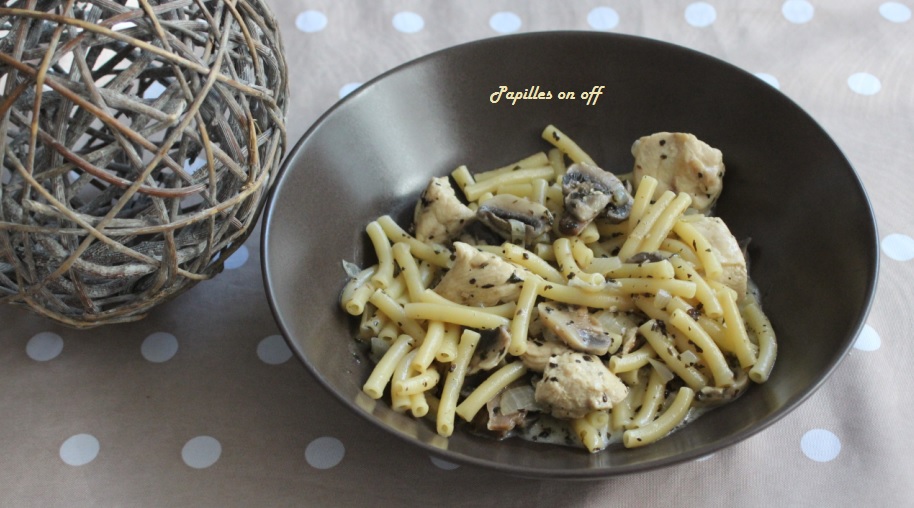 Pour mon troisième essai de « one pot pasta« , j’ai choisi les saveurs préférées de ma poupée (poulet et champignons) et me suis laissée porter par l’inspiration. Au final, un plat réussi, goûteux et devant lequel elle n’a pas fait la tête. Ouf !