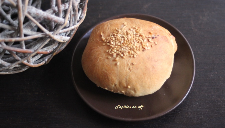 Dans le bol, placer le lait et la levure pour 3mn30, 37, 2. Ajouter la farine, le sucre, l’huile d’olive et le sel pour 3mn, bol fermé, épi. Placer la pâte dans un saladier et la laisser reposer au minimum 1h, pour qu’elle double de volume. Pendant ce temps, préparer la farce au bleu en mélangeant tous les ingrédients. Réserver. Lorsqu’il est temps de ressortir la pâte, lui incorporer les graines de courge. La diviser en 4, dégazer chaque pâton en l’aplatissant et enrouler la pâte sur elle-même sans appuyer pour qu’elle se charge d’air. Etaler les pâtons en grands ronds et les farcir du mélange au bleu. Les refermer et les souder. Les laisser reposer 30mn. Les décorer de sésame. Préchauffer le four à 220. Enfourner les pains ainsi qu’un petit récipient contenant de l’eau et cuire 20mn.