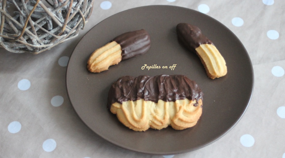 Préchauffer le four à 180. Détendre le beurre au batteur. Lui ajouter le sucre glace, la vanille, l’œuf et la farine. Bien mélanger. Placer la pâte dans une poche à douille munie d’une grosse douille cannelée et dresser vos sablés sur une plaque de four chemisée. Cuire 10mn pour les petits et 15 pour les gros. Une fois refroidis, les tremper à moitié dans le chocolat fondu. Laisser sécher à l’air libre sur du papier sulfurisé.