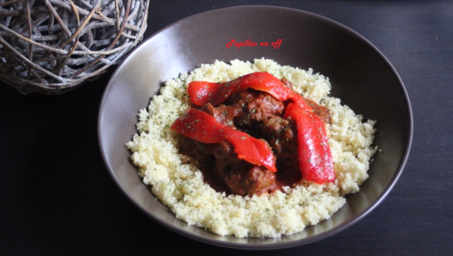 Préparer les boulettes en mélangeant tous les ingrédients ensemble. Former des boulettes. Réserver. Préparer la sauce. Dans une sauteuse, faire chauffer de l’huile d’olive pour y faire revenir l’oignon émincé. Ajouter les tomates pelées et épépinées, les épices, du sel et du poivre. Cuire 10mn à feu moyen en mélangeant régulièrement. Ajouter l’eau et le concentré de tomates, bien mélanger. Déposer les boulettes et cuire 30mn à couvert, à feu moyen. La sauce doit réduire. 10mn avant la fin de la cuisson, ajouter les poivrons grillés en lanières. Servir avec de la semoule.