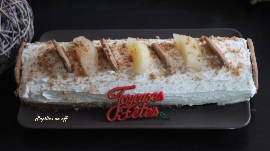 Préchauffer le four à 180. Préparer la génoise en battant les oeufs et le sucre pendant 10mn. Leur ajouter la farine, la maizena, les 4 épices et la levure. Verser sur une plaque de four recouverte de papier sulfurisé et cuire 8mn. Elle doit être bien colorée. La réserver, roulée dans un torchon humide. Préparer la crème au mascarpone. Mélanger les fromages avec les sucres jusqu’à obtention d’une pâte lisse. Réserver. Egoutter les poires en conservant le sirop avant de les couper en dés (en garder éventuellement pour la déco). Dérouler la génoise refroidie, l’imbiber du sirop des poires et recouvrir des ¾ de la crème au mascarpone. Rajouter les spéculoos émiettés ainsi que des dés de poires. Rouler la bûche. La recouvrir entièrement de la crème restante avant de la décorer.