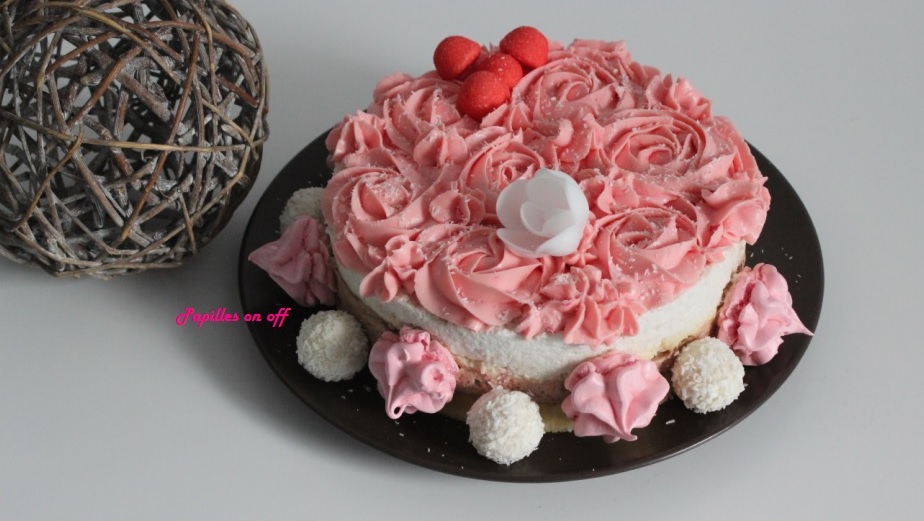 Préchauffer le four à 160. Préparer la génoise à la noix de coco. Blanchir les œufs entiers et le sucre jusqu’à ce que le mélange double de volume. Ajouter alors la farine, la maizena et la noix de coco. Le mélange doit être homogène. Placer dans un moule chemisé et cuire 15mn. Laisser tiédir avant de démouler et de placer dans un cercle, posé sur un plat de service. Préparer la mousse à la fraise. Dans une casserole, verser le coulis de fraises avec le sucre et l’agar agar. Porter le tout à ébullition pendant 2mn. Laisser tiédir hors du feu. Ensuite, monter la crème en chantilly bien ferme avec le sucre et le chantifix. Mélanger délicatement la chantilly avec le coulis gélifié. Verser sur la génoise à la noix de coco, dans le cercle. Mettre au congélateur 30mn.Pendant ce temps, préparer l’insert noix de coco en mélangeant le lait concentré sucré et la noix de coco râpée. Placer ce mélange entre deux couches de papier sulfurisé et l’étaler en un rond de 18cm. Mettre au frais 25mn. Déposer par dessus la mousse à la fraise. Réaliser la mousse à la noix de coco. Faire bouillir le lait de coco avec le sucre et l’agar agar dilué dans un peu d’eau pendant 2 minutes en remuant. Monter la crème liquide en chantilly ferme (placez saladier, fouet et crème 15 minutes au congélateur) et incorporer le chantifix et le sucre en poudre. Puis incorporer en plusieurs fois le lait de coco à l’aide d’une maryse. Verser par-dessus l’insert noix de coco. Mettre au frigo pour 3h. Préparer le topping à la fraise tagada. Dans une casserole, mettre les fraises tagada et la crème à fondre très doucement et réserver. La mélanger au mascarpone jusqu’à obtention d’une crème lisse. Placer au frais dans une poche à douille. Il vous suffira de la pocher sur l’entremet au dernier moment. Décorer à l’aide des meringues, des roses en sucre et de la noix de coco râpée.