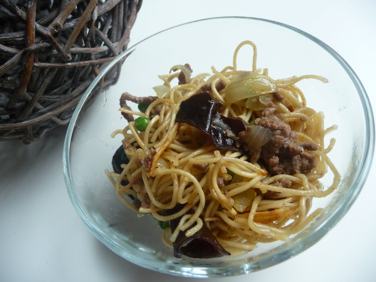 Réhydrater les champignons noirs dans de l’eau bouillante. Les égoutter et réserver. En parallèle, cuire les nouilles chinoises, les égoutter et les réserver également. Dans un wok, faire revenir l’huile et l’oignon à feu vif. Ajouter la viande. Lorsqu’elle est colorée, ajouter le curry jusqu’à ce que son odeur se dégage. Ajouter les champignons puis le bouillon et le soja. Bien remuer le tout avant de mettre les pâtes. Porter le tout à ébullition avant d’ajouter les petits pois. Baisser le feu et laisser cuire quelques minutes. Servir !