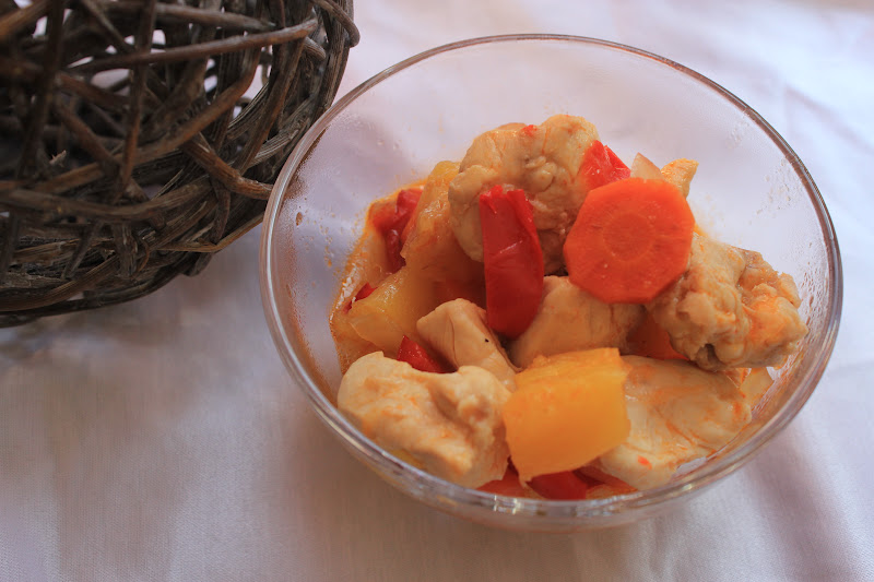 Couper les escalopes de poulet en dés. Les faire dorer dans un wok avec un peu d’huile d’olive. Pendant ce temps, émincer l’oignon, les carottes, le poivron et l’ananas. Retirer la viande du wok pour y faire sauter les légumes avec le bouillon. Porter le tout à petite ébullition, ajouter le vinaigre de riz, le ketchup, le sucre et le nuoc man. Remettre le poulet, le poivre Ajouter ensuite les dés de poulet, le poivre et laisser cuire jusqu’à ce que la sauce épaississe. Lorsque la sauce commence à réduire, et si la sauce n’est pas suffisamment épaisse, saupoudrer de maïzena.