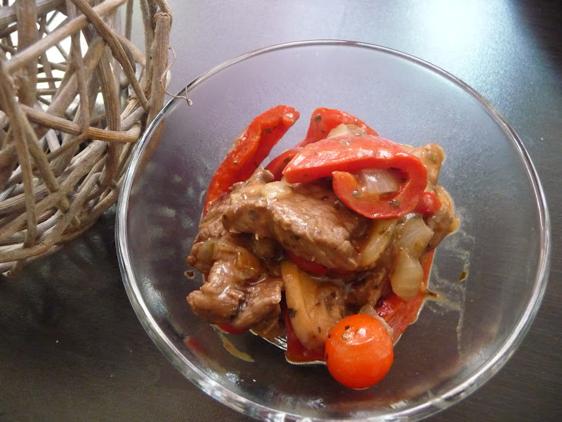 Faire chauffer l’huile d’olive. Y faire colorer l’oignon et le poivron pour 5mn environ. Ajouter la viande pour 3 à 4mn. Terminer par tous les autres ingrédients. Laisser mijoter jusqu’à ce que le fond de veau ait « fondu » et se soit transformé en une sauce archi goûteuse 🙂