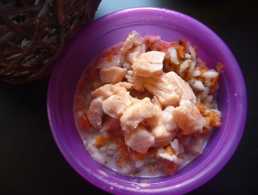 Mixer grossièrement la carotte et les champignons. Mettre l’eau à bouillir. Y plonger le riz et les légumes pour 18mn. Au terme de la cuisson, j’ai égoutté l’eau restante. Vous pouvez choisir de la garder ou pas. J’ai ajouté le saumon en petits morceaux, le persil, et la crème. J’ai fait chauffer 15s au micro ondes pour parfaire la cuisson du poisson. Vous pouvez également choisir de mixer le plat.
