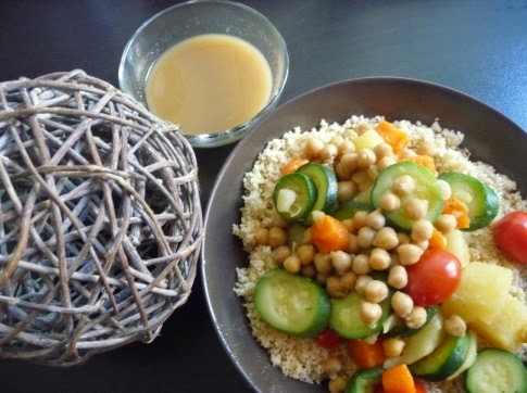 Une envie de dépaysement prête en 30mn ; je suis exigeante certains soirs… J’ai alors préparé cette semoule et ses légumes façon couscous végétarien et me suis régalée. Ma petite pépette a même eu envie de goûter dans mon assiette… et s’est resservie ! La prochaine fois, je ne mettrais pas les tomates… question de goûts 🙂