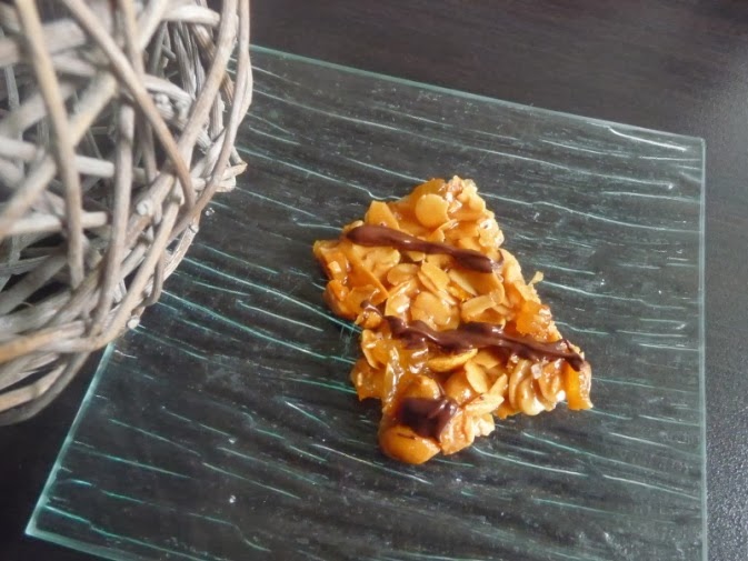 Préchauffer le four à 180. Dans une casserole, placer le miel, le beurre, le sucre et les zestes râpés. Faire fondre à feu doux puis porter à ébullition. Hors du feu, ajouter les amandes, les dés d’oranges confites et les cacahuètes. Bien mélanger. Verser cette préparation sur une plaque recouverte de papier cuisson. Etaler en couche fine. Cuire une quinzaine de minutes jusqu’à obtention d’une teinte blonde régulière. (Attention à bien rester devant le four, ça brûle plutôt vite!). Sortir le florentin du four, le parsemer de feuille de sel et découper des carrés de 5cm. L’ensemble est encore un peu mou et c’est normal. Laisser totalement refroidir. Faire fondre le chocolat et réaliser les traits. Laisser refroidir à nouveau.