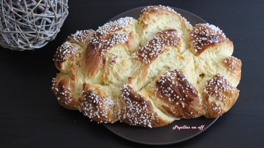 Dans la cuve de la MAP, placer tous les ingrédients (sauf le lait et le sucre perlé), en commençant par les liquides. « Programmer Pâte à pâtes » (12mn pour moi). Former une boule avec la pâte et la laisser lever 3h. Dégazer la pâte, la tresser et la remettre à lever pour 1h30. Préchauffer le four à 180. Dorer la brioche avec le jaune restant. Saupoudrer de sucre perlé. Cuire 10mn. Baisser le four à 150 et cuire 15 à 20mn supplémentaires.